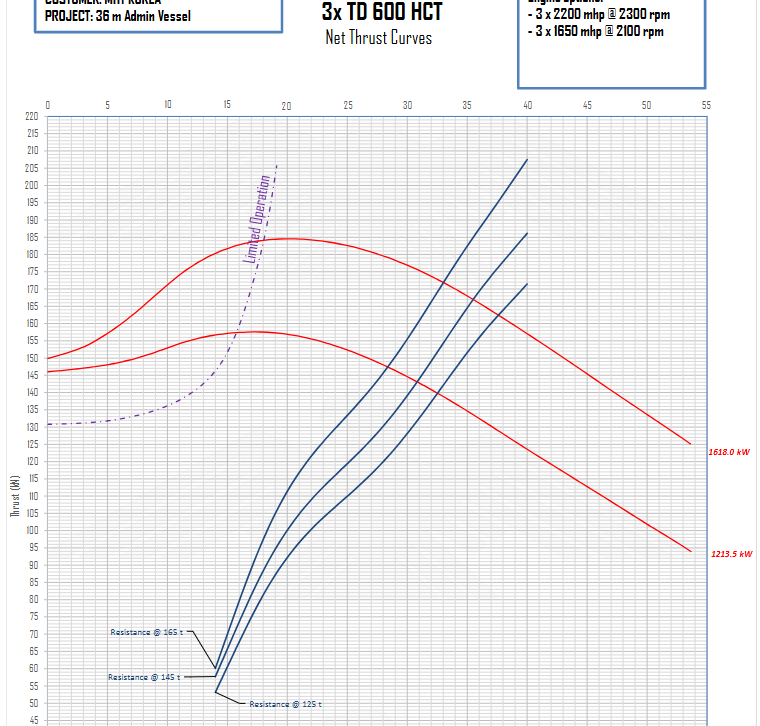 아래 속도 측 그래프는 총 중량 160 톤에 선박에 엔진2000 마력 3대를 적용 시에 예상되는 선박의 속도 입니다.